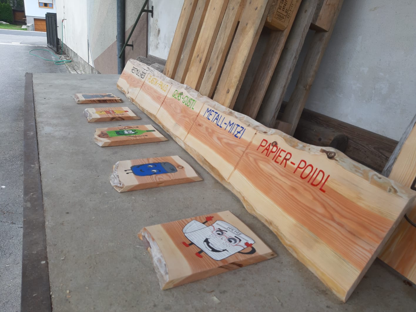 Am Ende des Tages beschließen die Erwachsenen gemeinsam einen ansprechenden Müllplatz zu gestalten. Sie benennen die Mülleimer nach den Kindern, um ihre gemeinsame Geschichte in Erinnerung zu behalten und an andere Kinder weiterzugeben.